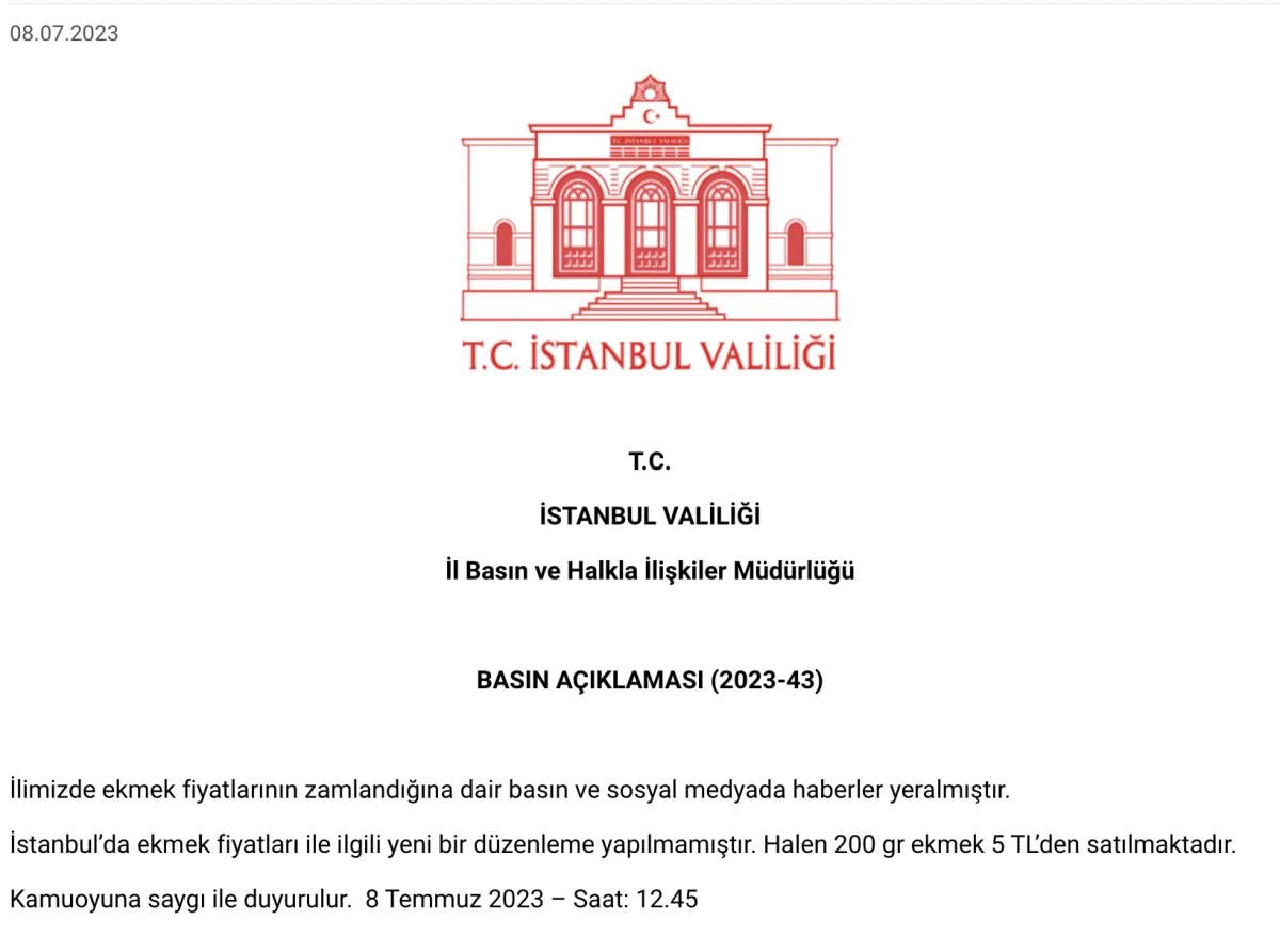 Kentte ekmek fiyatları ile ilgili bir düzenleme yapılmadığına dair bir basın açıklaması yayınlandı.