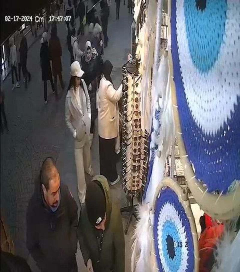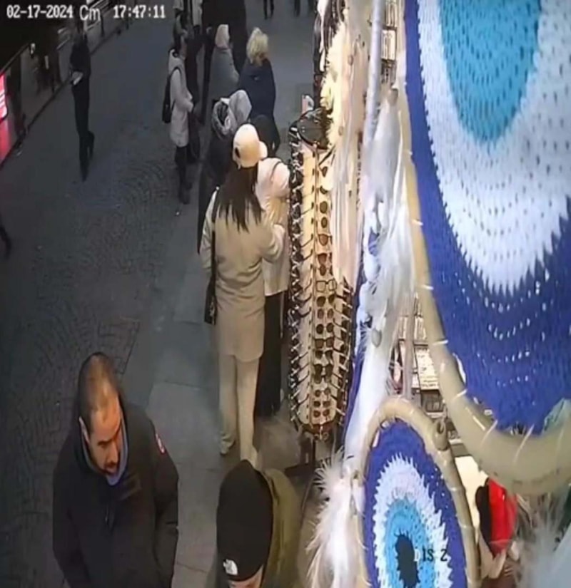 Hollanda'dan hafta sonu gezmek için İstanbul'a gelen Buket Buğday, bir hediyelik eşya mağazası önündeki eşyaları incelerken, 2 hırsızın dikkatini çekti.