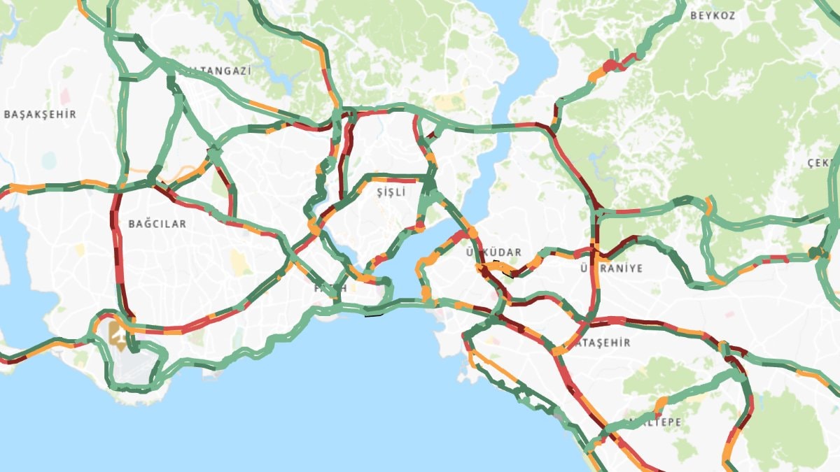 İBB CepTrafik haritası verilerine göre, trafik yoğunluğu Avrupa Yakası'nda yüzde 58, Anadolu Yakası'nda yüzde 78'e kadar ulaşırken, kent genelinde yüzde 67'ye çıktı.