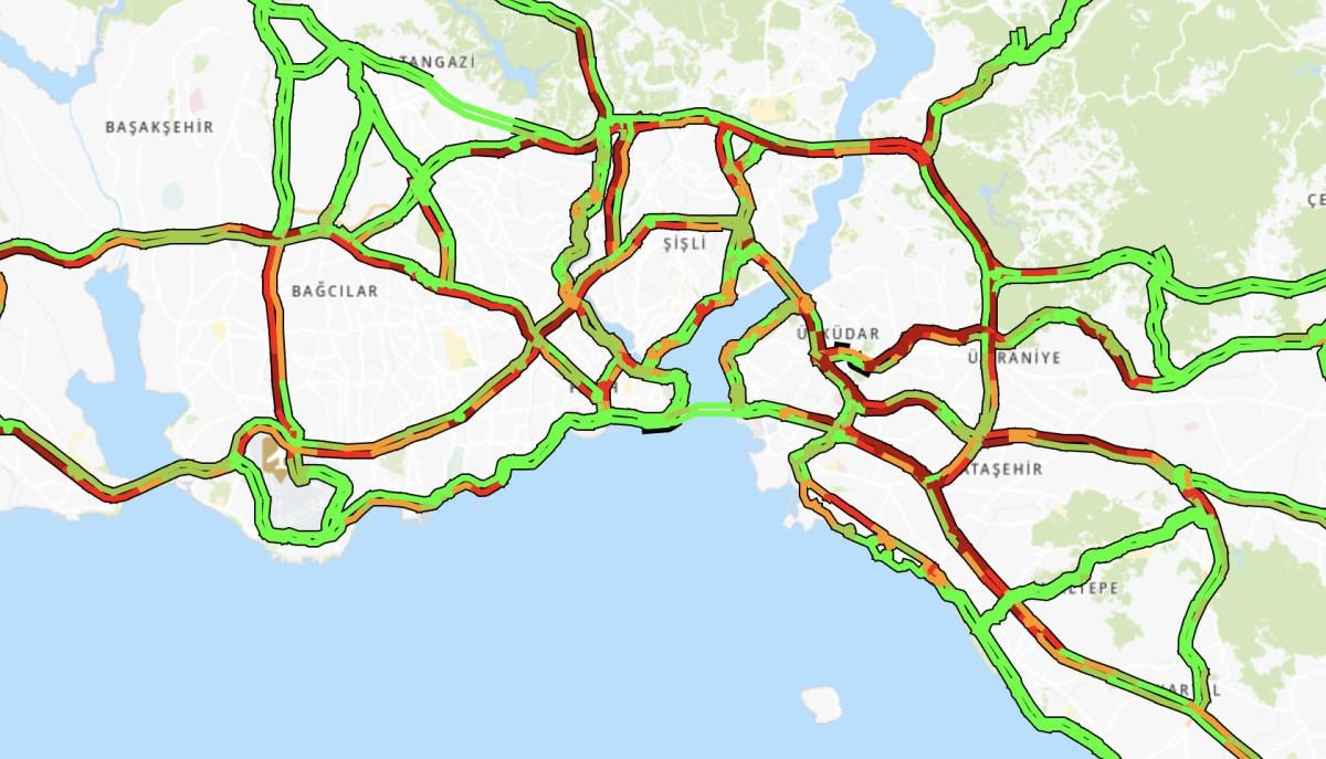 İstanbul Büyükşehir Belediyesi (İBB) Trafik Yoğunluk Haritasına göre, kentteki trafik yoğunluğu yüzde 85'e çıktı.