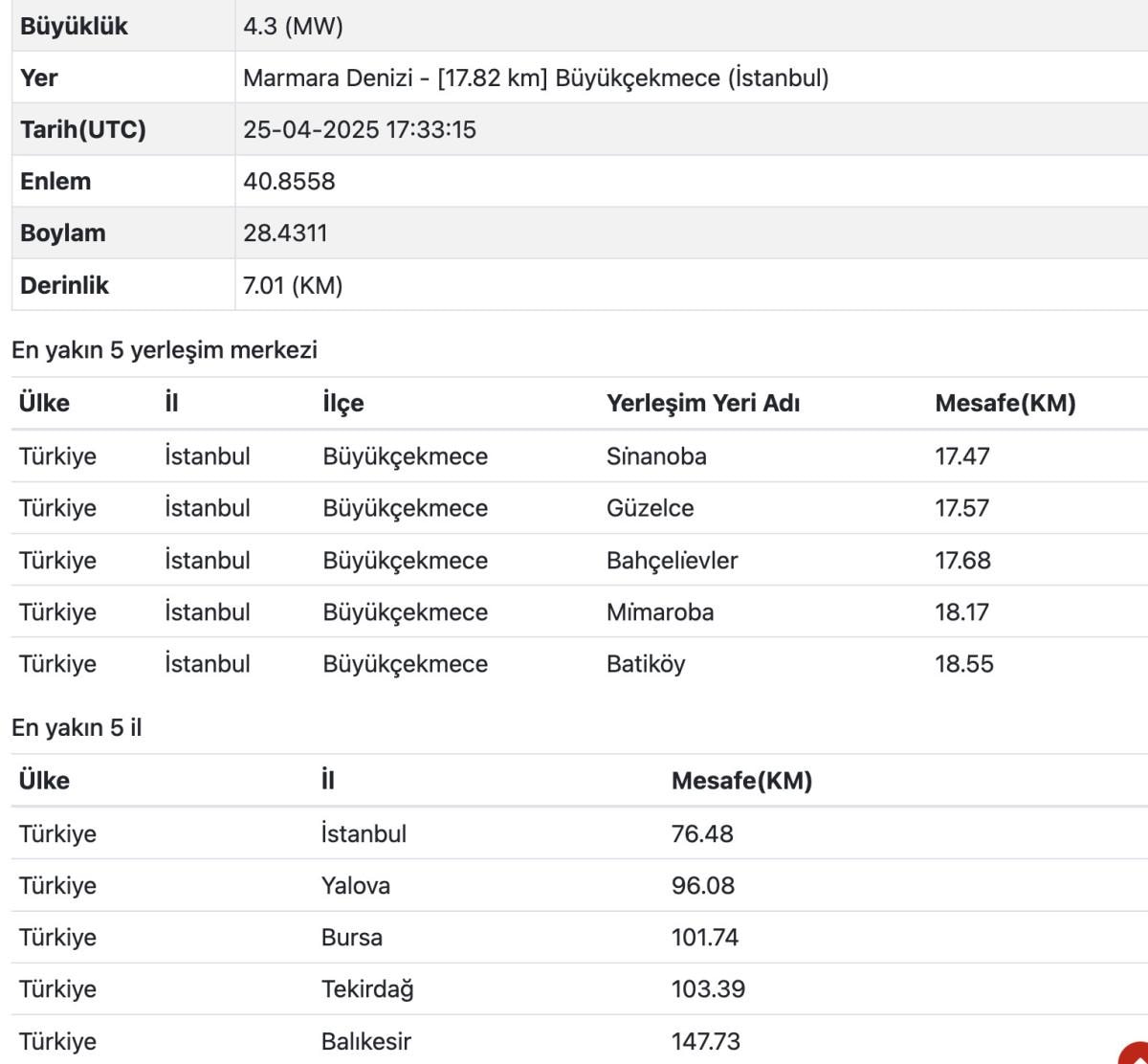 25 Nisan 2025 tarihinde saat 20.33’te Marmara Denizi’nde 4.3 büyüklüğünde bir deprem meydana geldi. AFAD verilerine göre yerin 7.01 kilometre derinliğinde gerçekleşen depremin merkez üssü, İstanbul’un Büyükçekmece ilçesine yaklaşık 17.8 kilometre uzaklıkta bulunuyor.