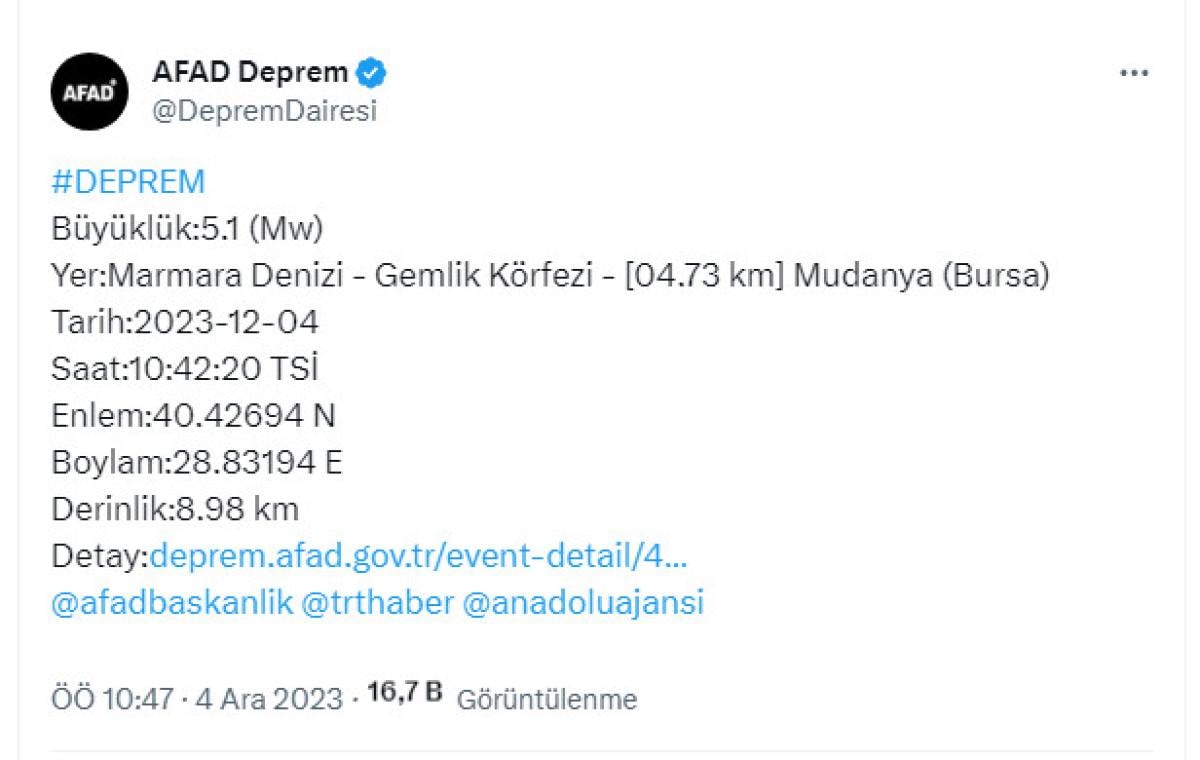 Açıklamada, "Marmara Denizi, Gemlik Körfezi’nde (Bursa Mudanya açıkları) meydana gelen 5.1 ve 4.5 büyüklüklerindeki depremler sonrasında an itibarıyla olumsuz bir durum bulunmamaktadır. Saha tarama çalışmaları devam etmektedir. Ekiplerimiz teyakkuz halindedir. Etkilenen vatandaşlarımıza geçmiş olsun dileklerimizi sunarız." ifadeleri yer aldı.