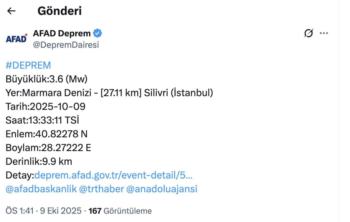 Afet ve Acil Durum Yönetimi Başkanlığı'ndan (AFAD) edinilen bilgiye göre, İstanbul ve yakın şehirlerde hissedilen deprem, Marmara Denizi'nde meydana geldi.