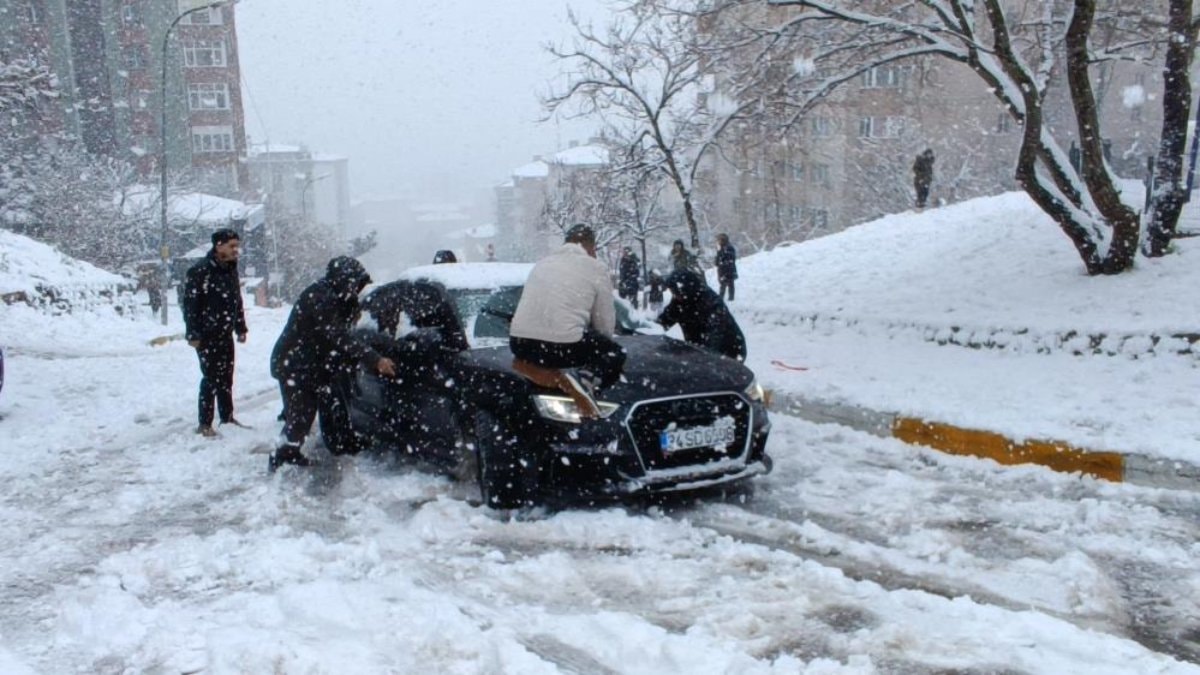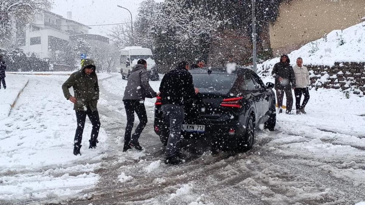 Kartal Hürriyet Mahallesi'nde yokuşu çıkamayarak mahsur kalan araç sürücüsünün yardımına çevredeki vatandaşlar ve çocuklar koştu.