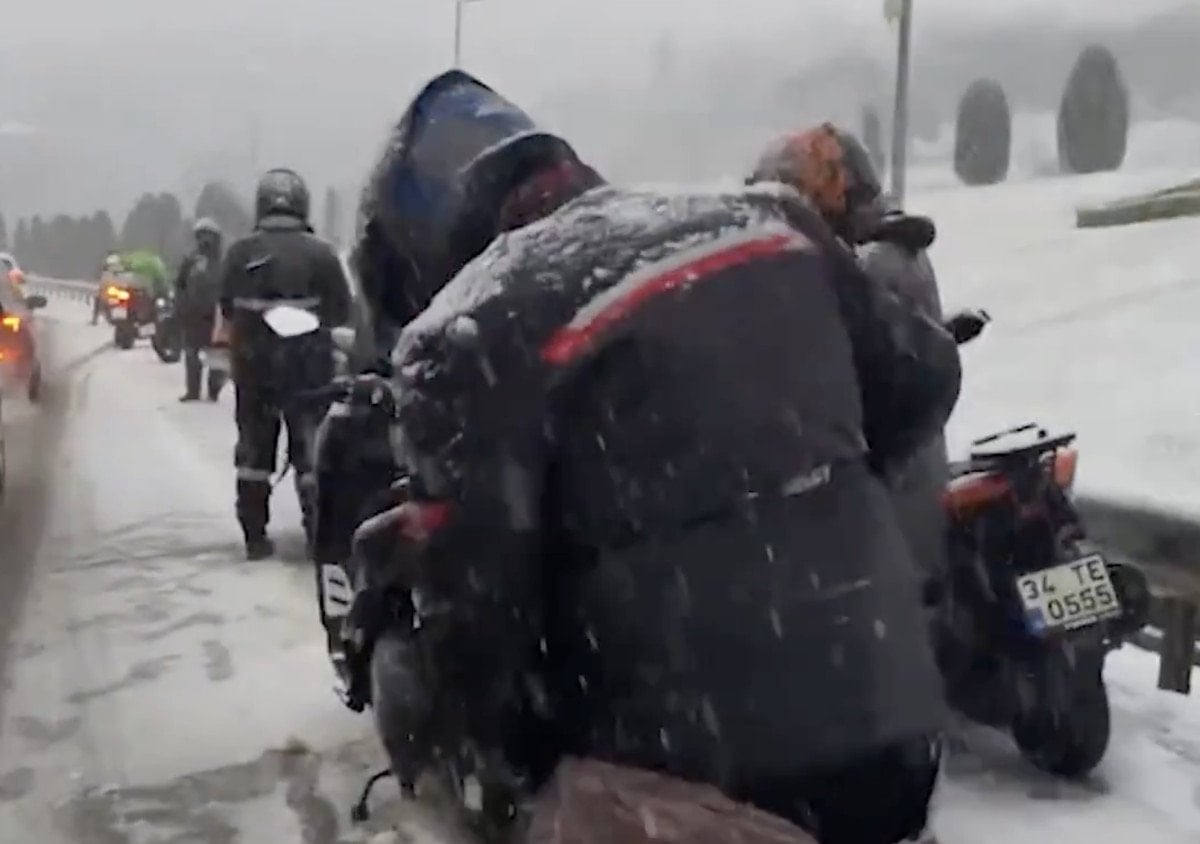- Motosiklet sürücüleri, karla kaplı yol kenarlarında beklemek zorunda kaldı.