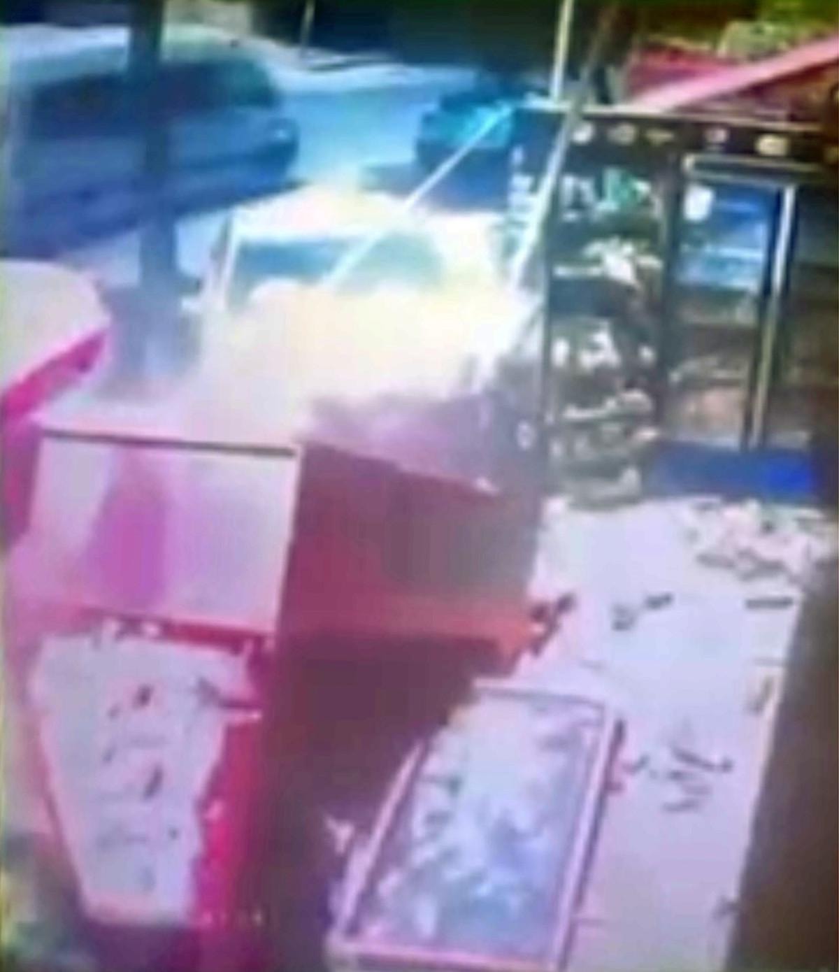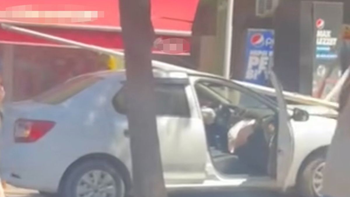 Araç, hızla bir bakkalın önünde bulunan içecek dolaplarına çarptı.