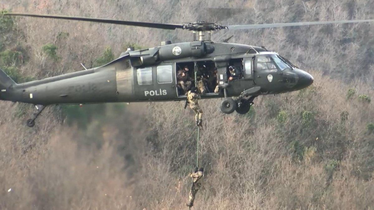 Tatbikat sırasında sığınağın bulunduğu bölgeye, helikopterden halatla takviye personel indirildi.