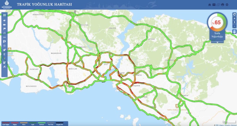 İstanbul Büyükşehir Belediyesi Trafik Yoğunluğu Haritası'na göre kentteki trafik yoğunluğu saat 13.07 itibarıyla yüzde 65 oldu.