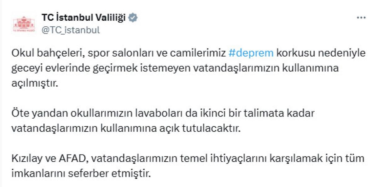 Konuyla ilgili İstanbul Valiliği'nden yapılan açıklamada, deprem korkusuyla evlerine giremeyen vatandaşlar için okul bahçeleri, spor salonları ve camilerin kullanıma açıldığını duyurdu..