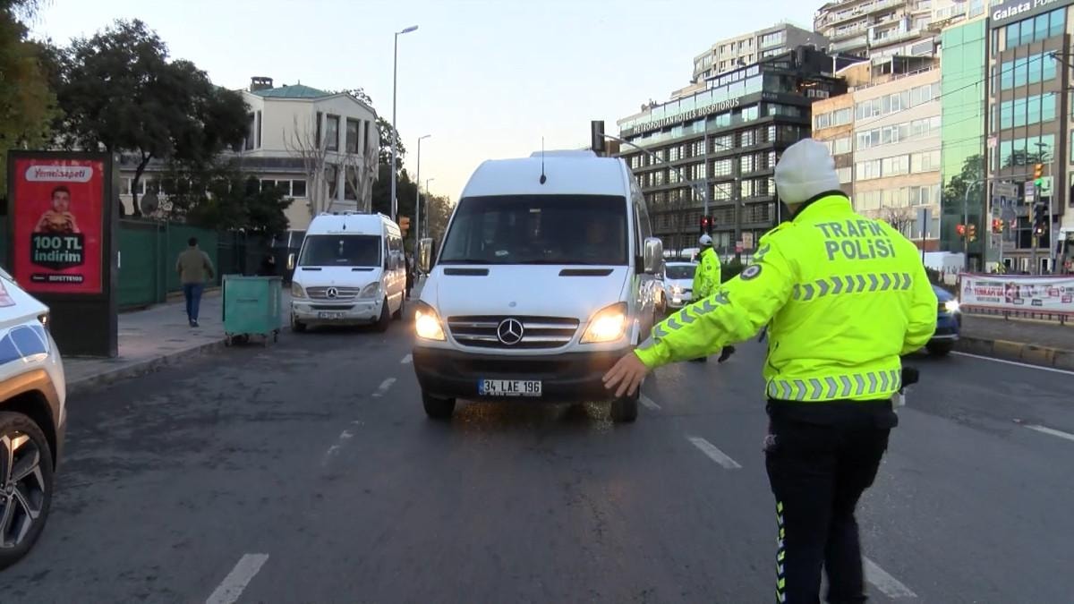 Beyoğlu Meclis-i Mebusan Caddesi'nde yapılan denetimlerde, servis araçlarının evrakları kontrol edilerek şoförlerin Genel Bilgi Taraması (GBT) yapıldı.