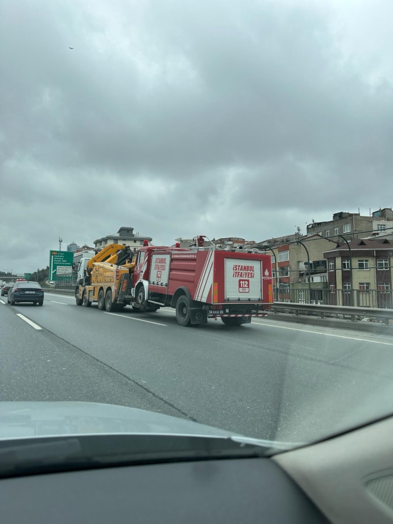 İstanbul'da çekilen bir kare, 5 yılı da özetler niteliğinde. Yolda kalan İBB'ye bağlı itfaiye aracı, çekiciyle birlikte götürüldü.
