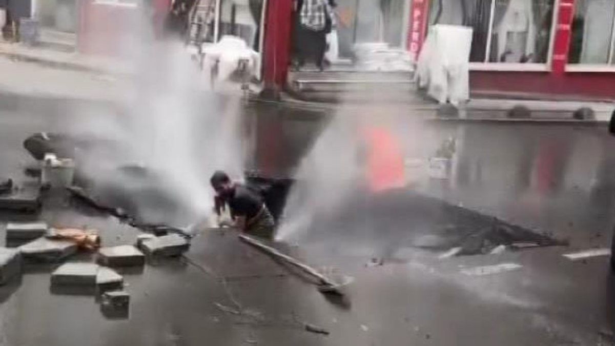 Yolda oluşan göçüğü ve patlayan su borusunu tamir etme çalışmaları, çevrede bulunan bir iş yerinin güvenlik kamerası tarafından kaydedildi.