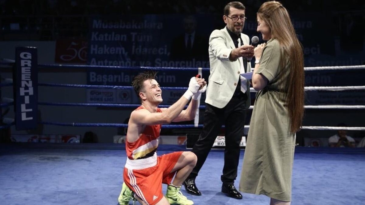 Fenerbahçeli boksör Doğan, 4 sene önce rakibi Umut Tepeli’yi mağlup ettikten sonra kız arkadaşı milli boksör Ayşenur Topal’a ringde evlilik teklifinde bulundu.