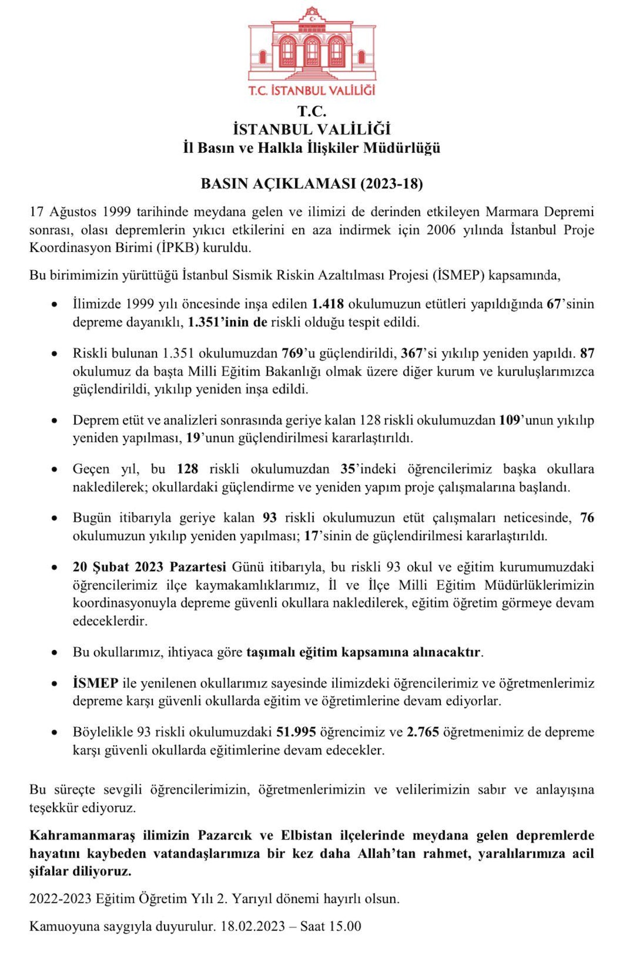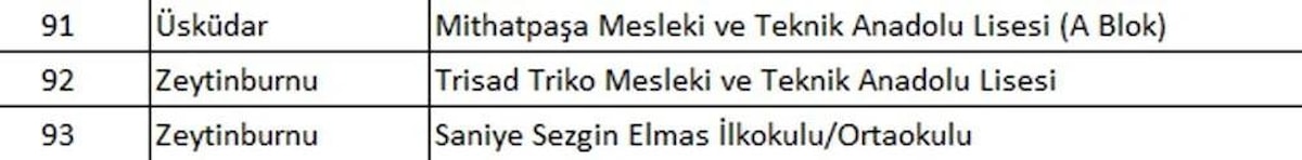 İstanbul Valiliği, megakentte riskli bulunan 93 okulda eğitim verilmeyeceğini ve söz konusu okulda öğrenim gören öğrencilerin başka okullara nakledileceğini açıkladı.