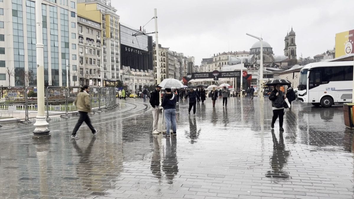Taksim Meydanı ve İstiklal Caddesi’nde yağmura yakalananlar, şemsiyeleriyle ıslanmaktan korunmaya çalıştı.