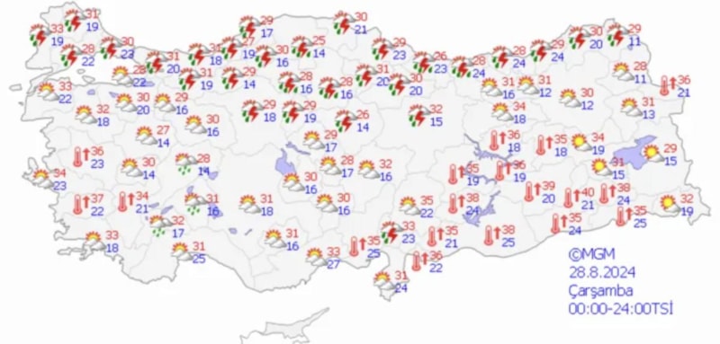Meteoroloji Genel Müdürlüğü'nün açıklamasına göre; Çankırı, Çorum, Kastamonu, Sinop’un iç kesimleri, Ordu ve Giresun çevrelerinde yerel olarak kuvvetli (21-50 kg/m²) gök gürültülü sağanak yağış bekleniyor.