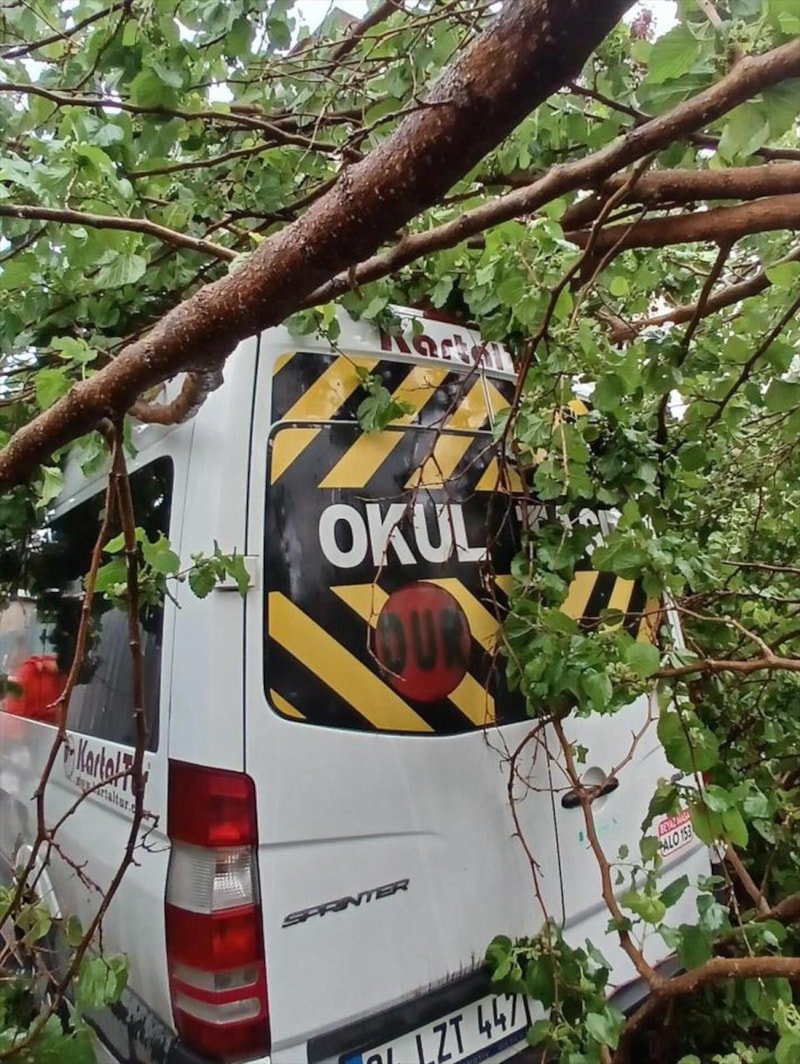 Altayçeşme Mahallesi Er Sokak'ta bulunan bir evin bahçesindeki ağaç, sağanak ve rüzgarın etkisiyle park halindeki otomobil ve servis minibüsünün üzerine devrildi.