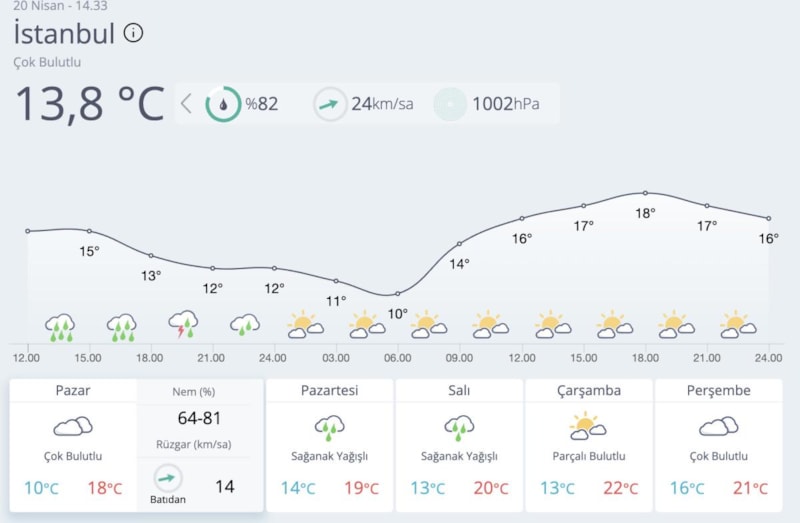 Meteoroloji Genel Müdürlüğü tarafından yapılan son değerlendirmelere göre: Ülke genelinin parçalı ve çok bulutlu, Marmara, Ege, Akdeniz, (Sivas hariç) İç Anadolu, Batı ve Orta Karadeniz ile Kars çevrelerinin sağanak ve gök gürültülü sağanak yağışlı geçeceği tahmin ediliyor.