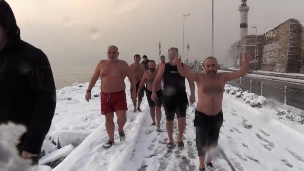 Kendilerine "Sarayburnu Fatihleri" adını veren grup ise dondurucu soğuğun altında denize girdi.
