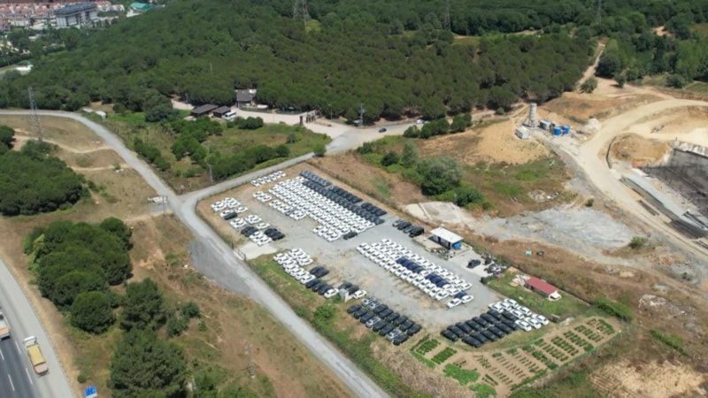 Görüntülerde aynı renk ve modellerden oluşan onlarca aracın yan yana dizildiği ve otoyol ile ormanlık alanın arasında bulunan etrafı çevrili çayırlık alanda stoklandığı görüldü.