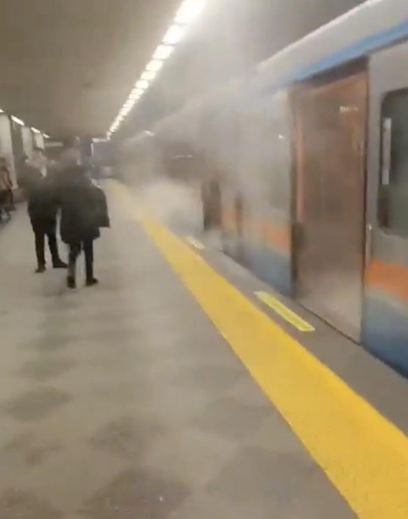 Durakta bekleyen bir metronun tüm vagonlarından yoğun dumanlar yükseldi. Araç içindeki yolcular tahliye edilirken seferler ise aksadı.