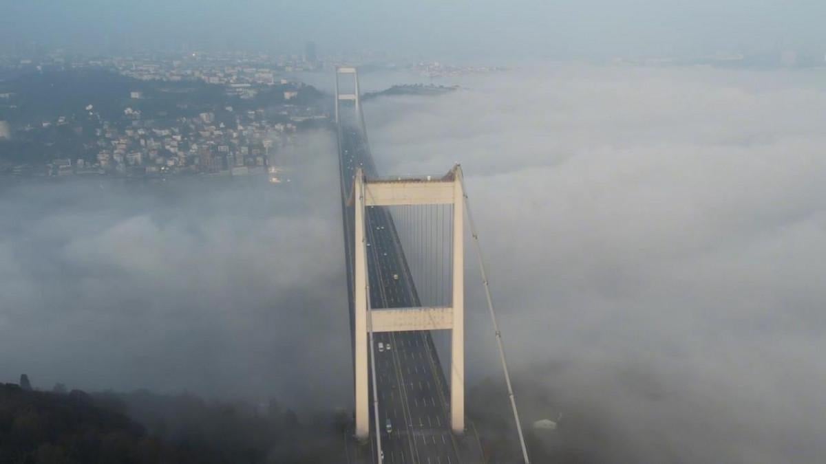 Sis altındaki Fatih Sultan Mehmet (FSM) Köprüsü havadan görüntülenerek sisin boyutları gözler önüne serildi.