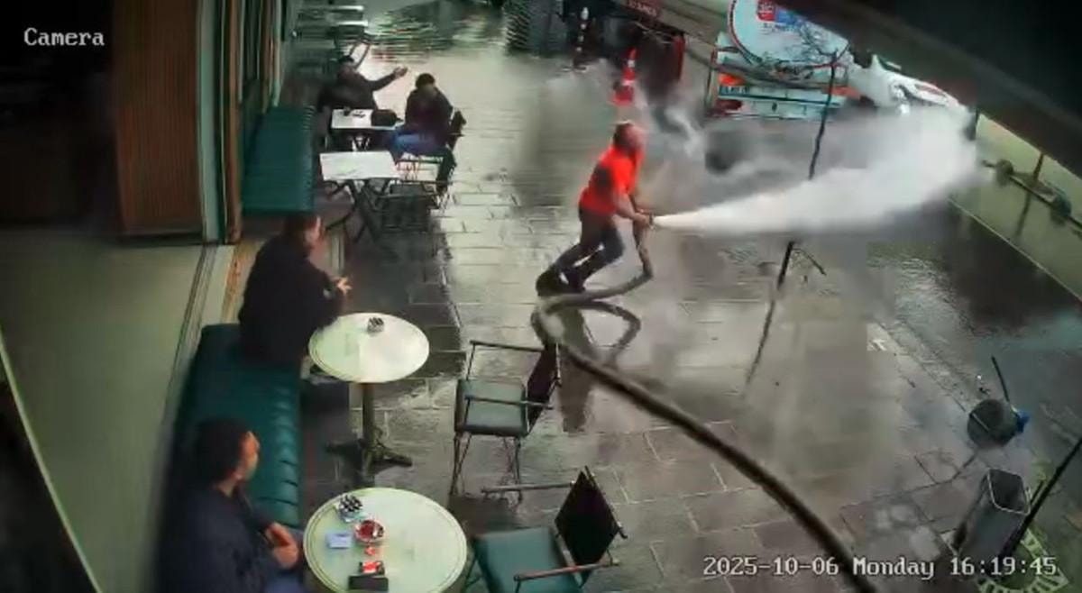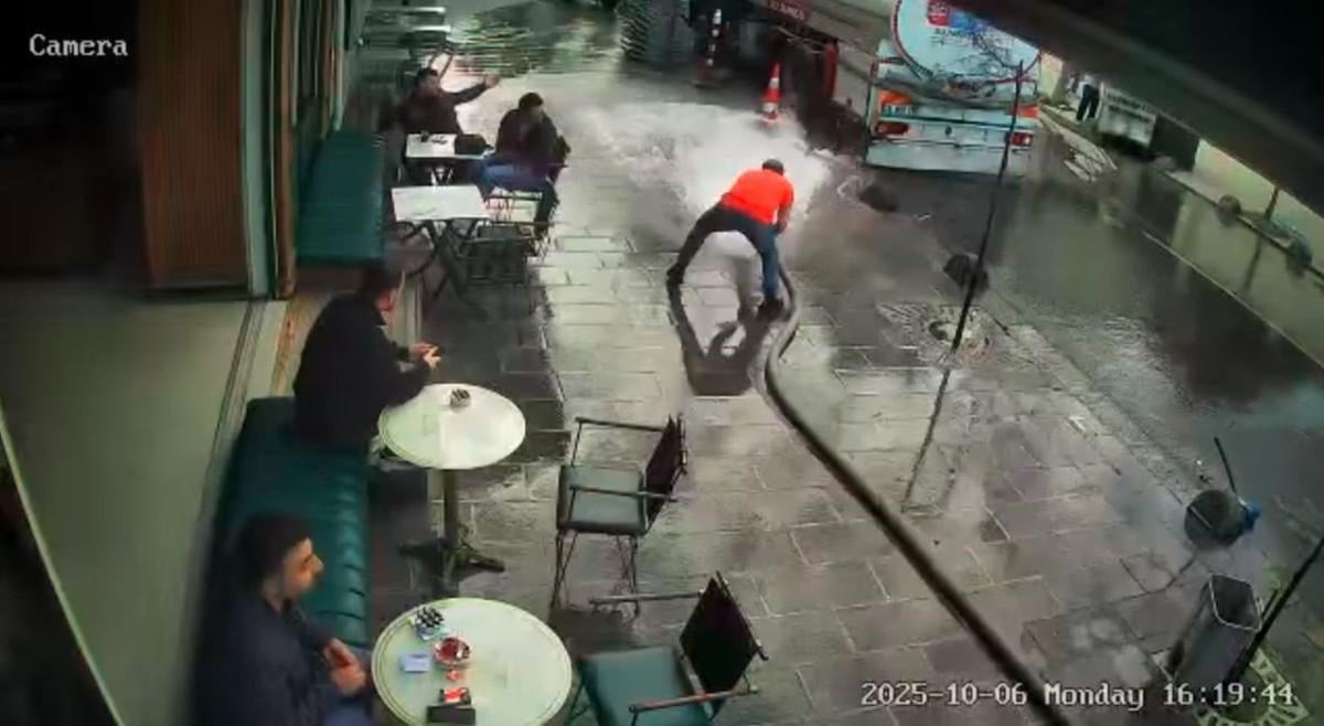 - Bayrampaşa'da bir kafe işletmecisi, iş yerinin önünü tazyikli su ile yıkamak isterken hortumun kontrolünü kaybetti.