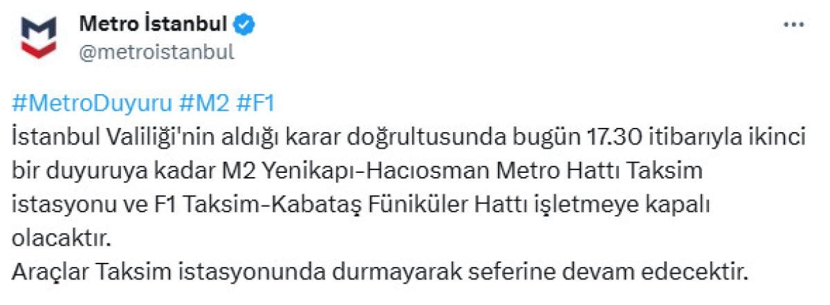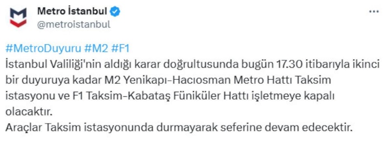 Açıklamada İstanbul Valiliği'nin aldığı karar neticesinde bugün 17.30 itibarıyla ikinci bir duyuruya kadar M2 Yenikapı-Hacıosman Metro Hattı Taksim istasyonu ve F1 Taksim-Kabataş Füniküler Hattı kapatıldı..