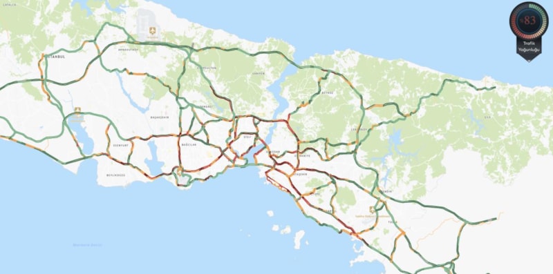 Hafta sonununun ilk gününde bazı bölgelerde trafik yoğunluğu yaşanırken, İBB'ye ait trafik yoğunluğu haritasına göre yoğunluk yüzde 83 olarak ölçüldü.
