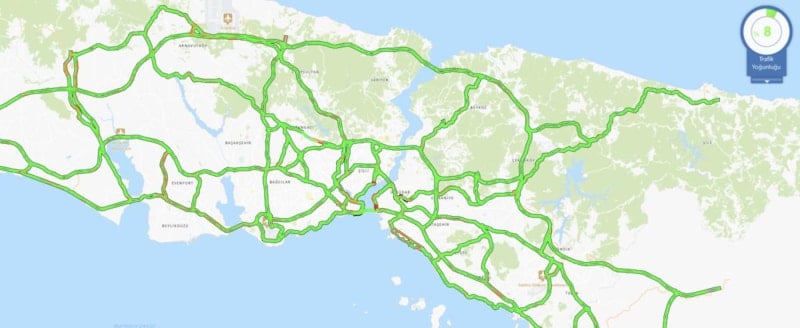 Trafik yoğunluğu haritasının neredeyse tamamının, yeşil renge büründüğü görüldü.