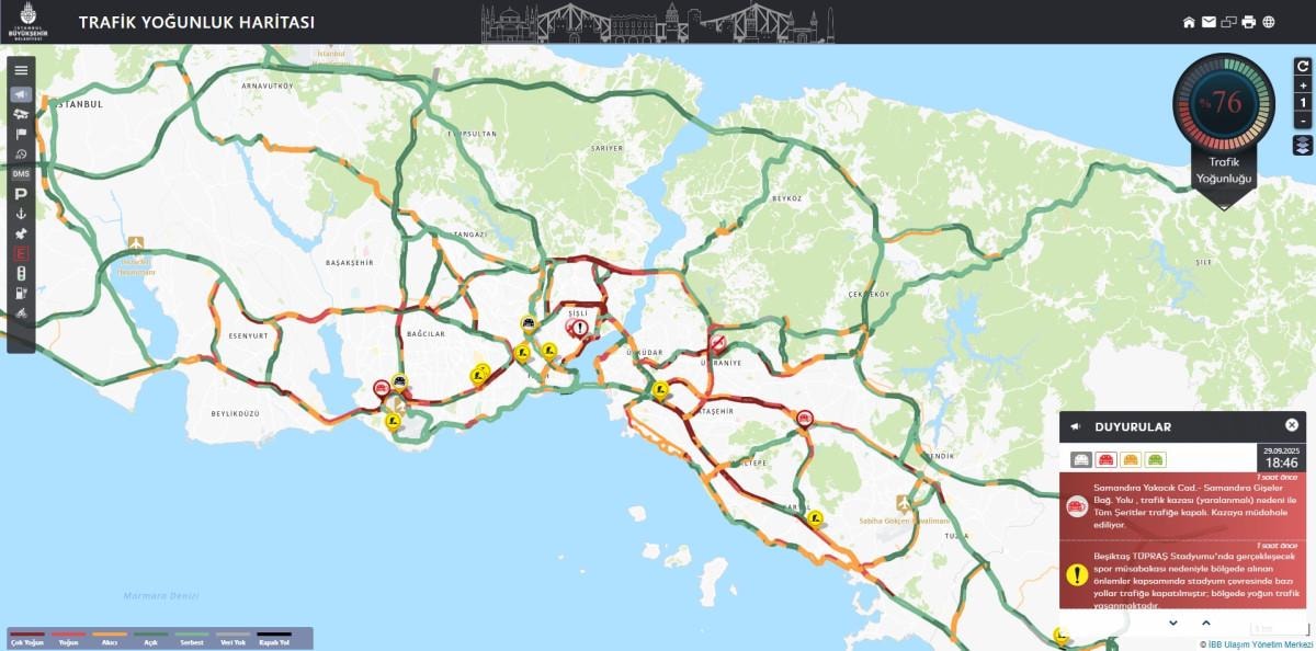 İstanbul Büyükşehir Belediyesi Trafik Yoğunluğu Haritası verilerine göre saat 18.45 itibarıyla yoğunluk yüzde 76'ya ulaştı.