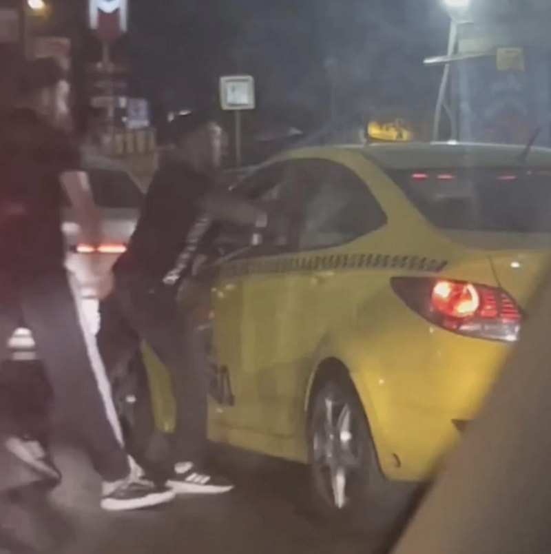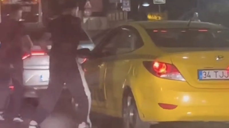Otomobilden inen iki saldırgan, taksiye tekmeler atarak zarar verirken taksi şoförünü yumruklayarak darbetti.