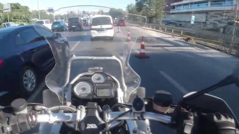yaya üst geçidi yenileme çalışmaları nedeniyle oluşan trafik yoğunluğundan kaçmak isteyen sürücüler tehlikeye aldırmadan ekiplerin ulaşıma kapadığı şeride girdiği anlar araç kamerasına yansıdı.
