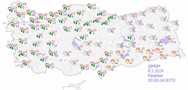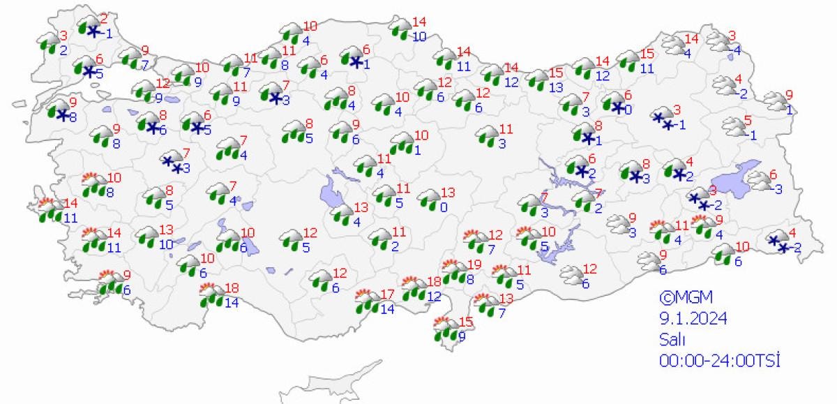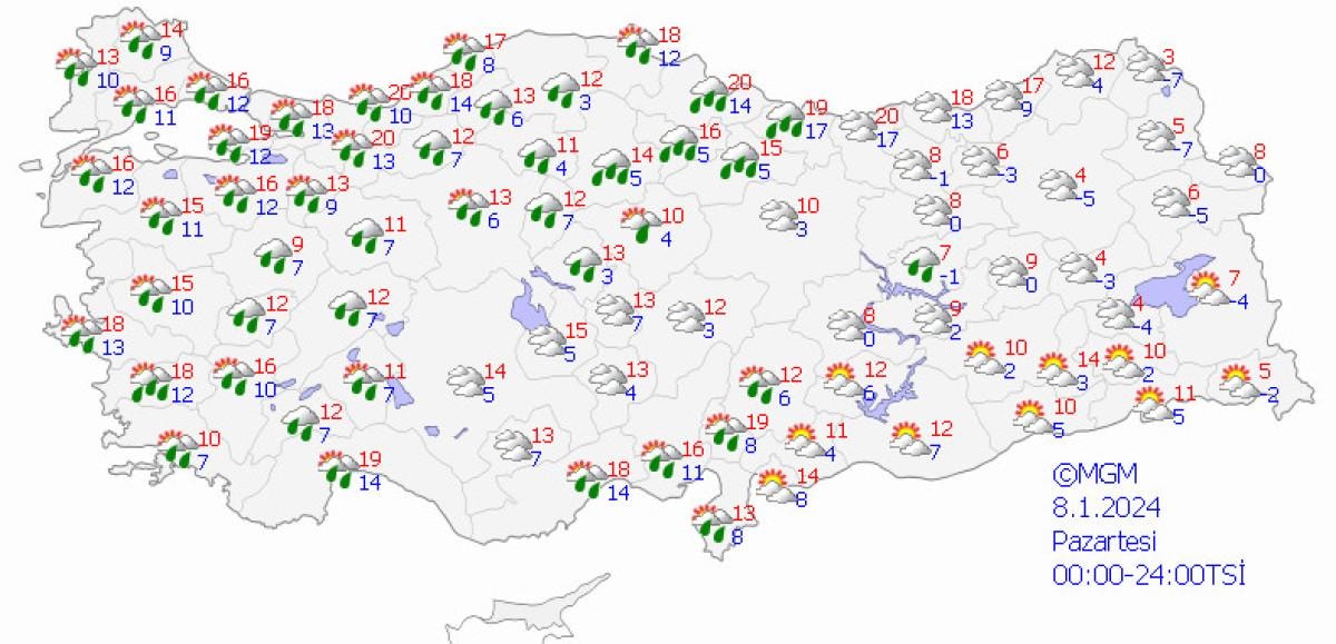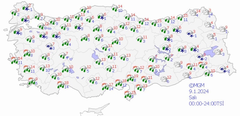 MGM açıklamasında, "Buna bağlı olarak öncelikle bölgemizde sağanak ve yer yer gök gürültülü sağanak şeklinde başlayacak yağışların, zamanla tüm bölgede etkili olacağı tahmin ediliyor. 09.01.2024 salı gününden itibaren hava sıcaklıklarındaki azalmayla birlikte, yağmur, zamanla Trakya‘da ve İstanbul’da karla karışık yağmur, bölgemizin kuzeyinde ve yüksek kesimlerinde hafif kar yağışı şeklinde olması bekleniyor." ifadelerine yer verildi.