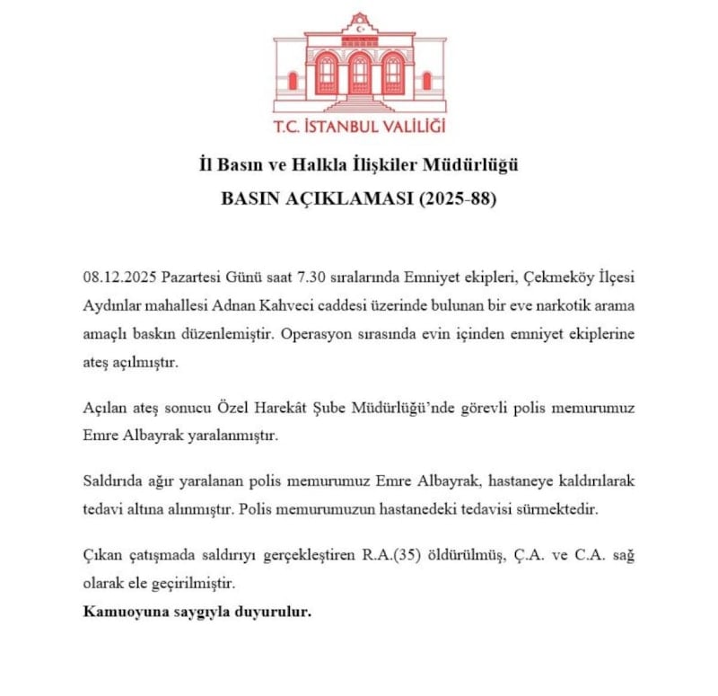 "08.12.2025 Pazartesi Günü saat 07.30 sıralarında Emniyet ekipleri, Çekmeköy İlçesi Aydınlar Mahallesi Adnan Kahveci Caddesi üzerinde bulunan bir eve narkotik arama amaçlı baskın düzenlemiştir.