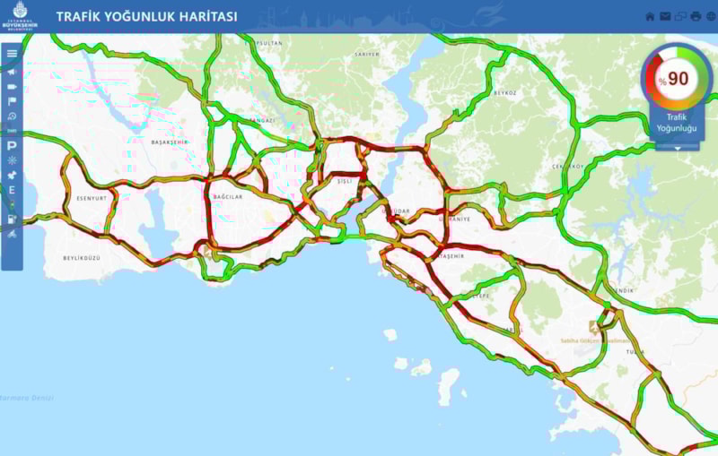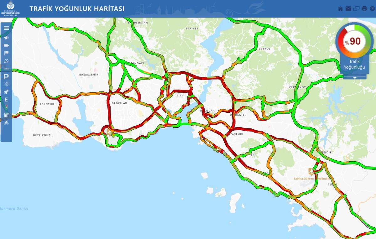 İstanbul Büyükşehir Belediyesi (İBB) Trafik Yoğunluğu Haritası'na göre kentteki trafik yoğunluğu saat 18.00'de yüzde 90'lara çıktı.