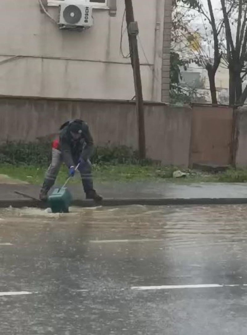 Sular altına kalan yerler ve bir temizlik işçisinin tıkanan gideri açmak için verdiği mücadele, cep telefonu kamerası ile görüntülendi.