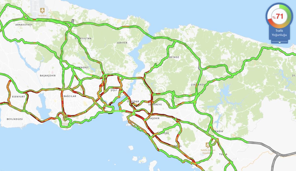 İBB'nin haritasına göre, kent genelindeki trafik yoğunluğu yüzde 71'e ulaştı.
