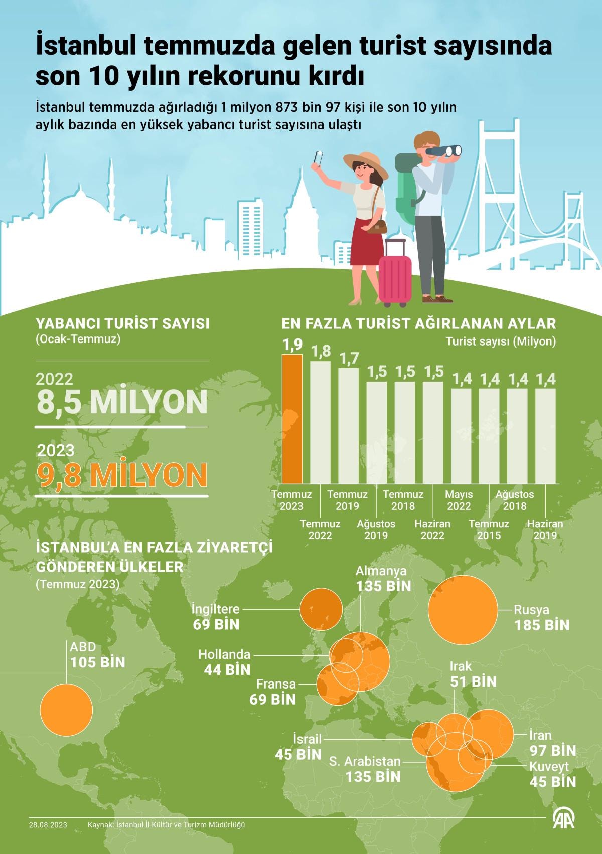 İstanbul'u temmuzda ziyaret edenlerin yüzde 9,91'i Rusya'dan, yüzde 7,24'ü Almanya'dan, yüzde 7,21'i Suudi Arabistan'dan, yüzde 5,61'i ABD'den, yüzde 5,20'si İran'dan, yüzde 3,70'i Fransa'dan, yüzde 3,68'i İngiltere'den (Birleşik Krallık), yüzde 2,74'ü de Irak'tan gerçekleşti.