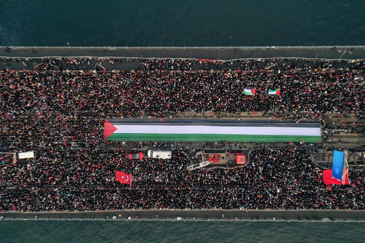 Kadın-erkek, genç-yaşlı demeden bir araya gelen halk, "Şehitlerimize Rahmet, Filistin'e Destek, İsrail'e Lanet" sloganıyla sesini yükseltti.