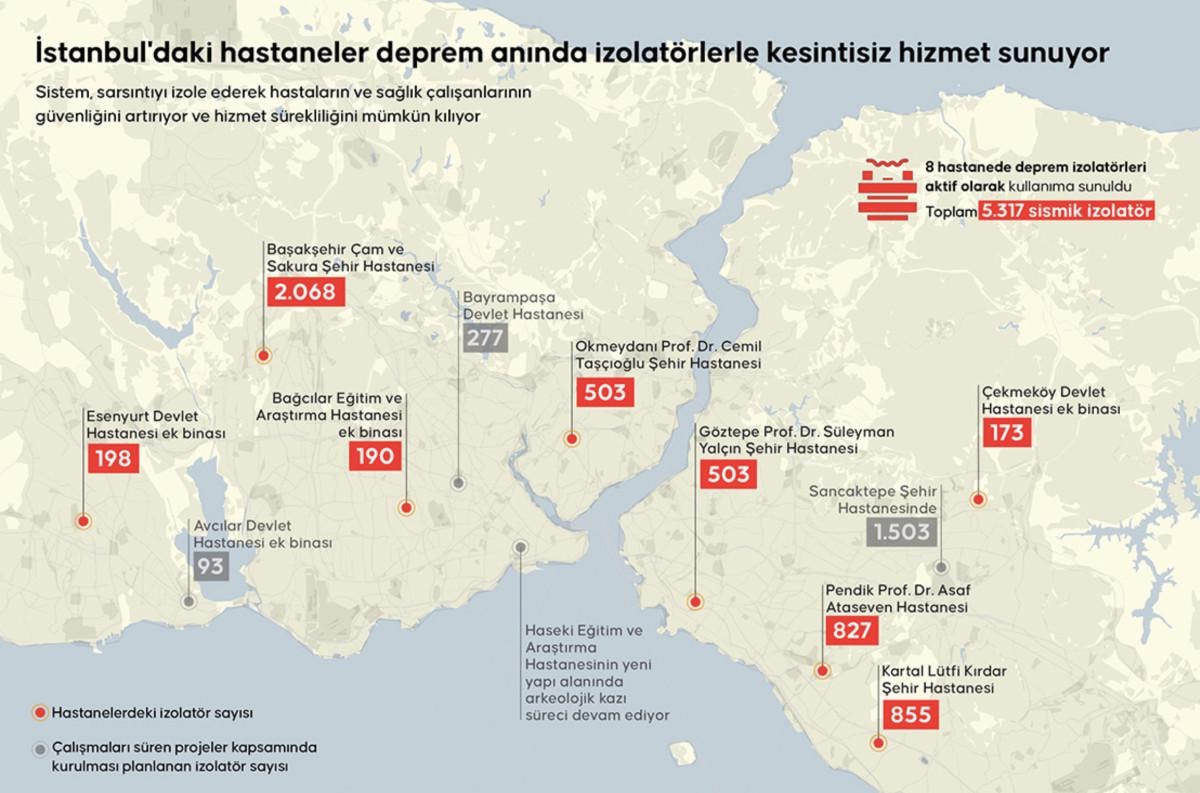 Deprem izolatörüyle donatılmış hastaneler arasında, 2 bin 68 izolatörle Başakşehir Çam ve Sakura Şehir Hastanesi, 855 izolatörle Kartal Lütfi Kırdar Şehir Hastanesi, 827 izolatörle Pendik Prof. Dr. Asaf Ataseven Hastanesi yer alıyor.