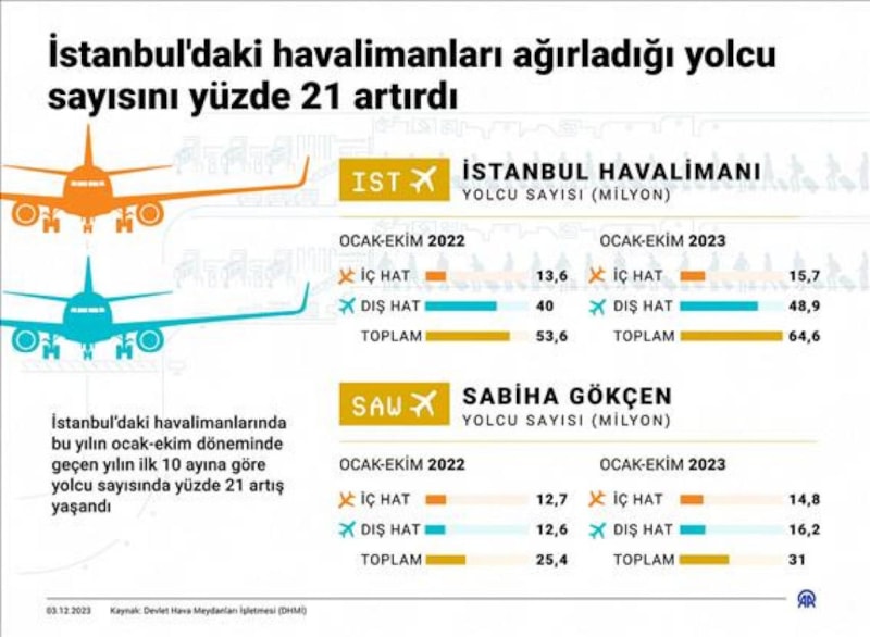Bu yılın 10 ayında icra edilen 637 bin 204 geliş ve gidiş seferiyle toplam 95 milyon 565 bin 514 kişinin seyahat ettiği İstanbul'daki havalimanları, 2022'nin aynı dönemine göre yolcu sayısını yüzde 21 artırdı.