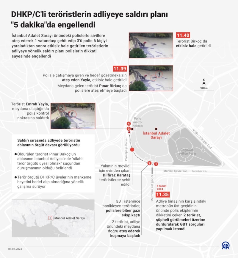 Çağlayan'daki İstanbul Adalet Sarayı önündeki polislerle bazı vatandaşlara silahla ateş ederek bir vatandaşı şehit edip, 3'ü polis 6 kişiyi yaraladıktan sonra etkisiz hale getirilen teröristlerin adliyeye yönelik saldırı planı, hareketlerinden şüphelenerek durduran polislerin dikkati sayesinde engellendi.