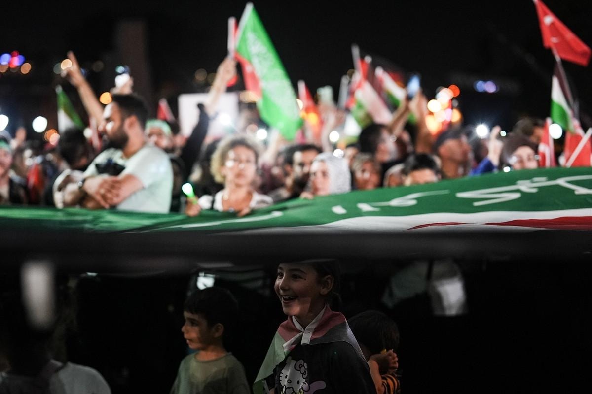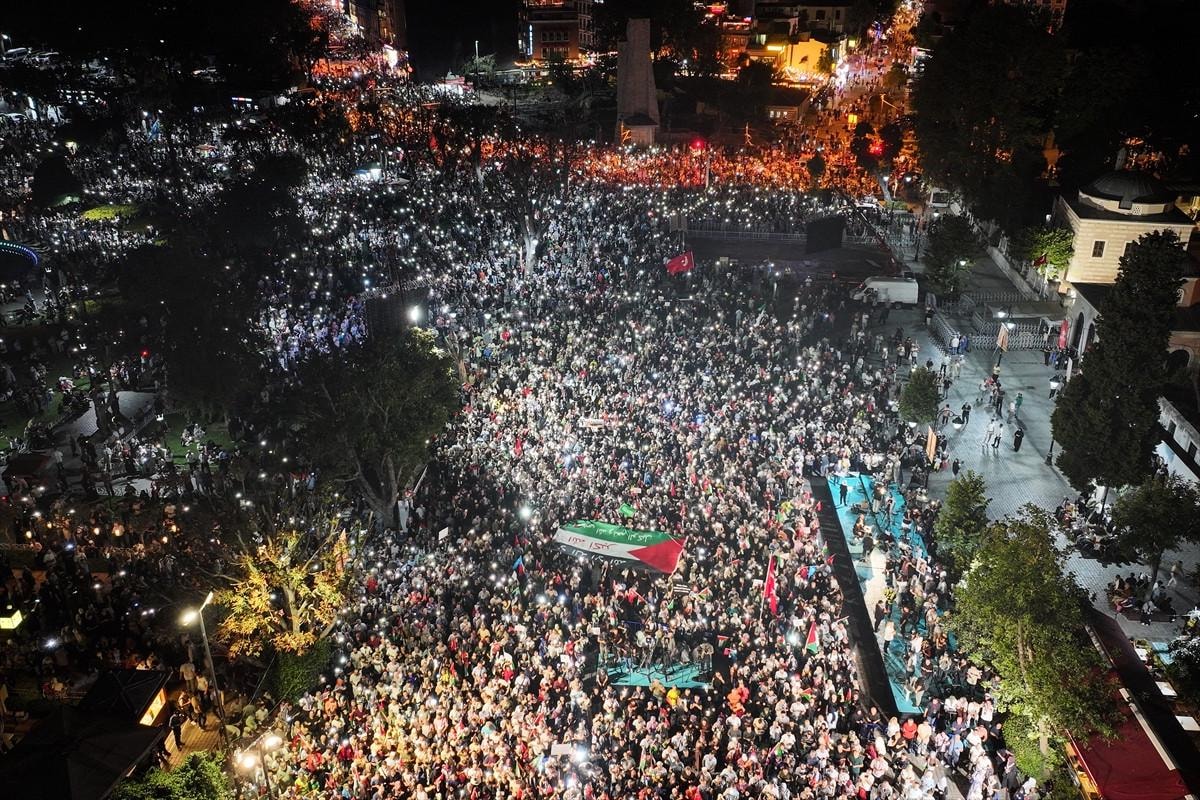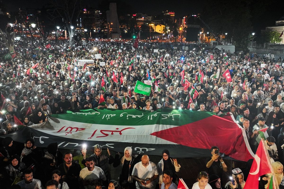 "Zalim İsrail, Filistin'den defol", "Gazzeli çocuklar bizi bekliyor" ve "Gazze'nin izzeti, diriltiyor ümmeti" sloganları atan kalabalık, Ayasofya-i Kebir Camii'ne doğru yürüyüşe geçti.