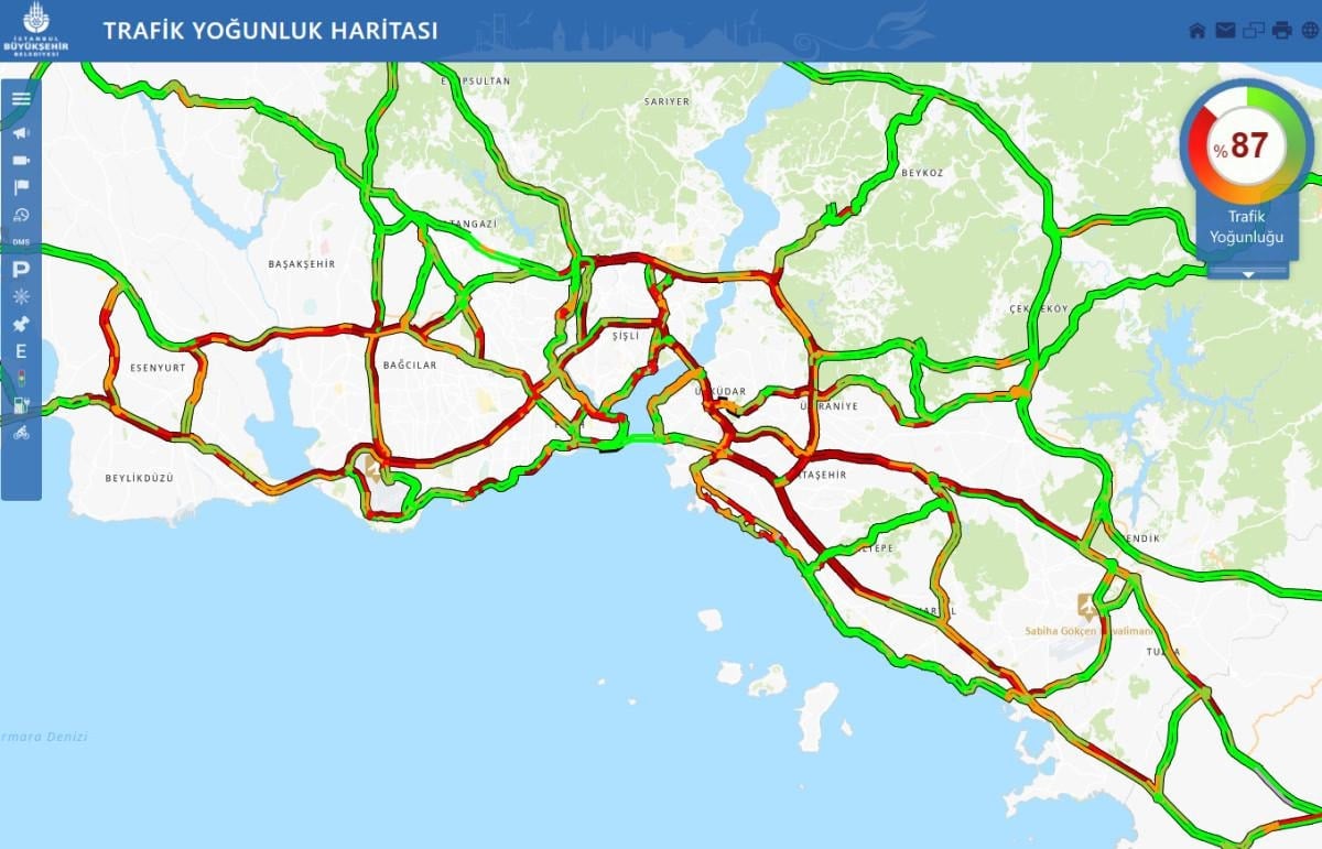 İstanbul Büyükşehir Belediyesi (İBB) Trafik Yoğunluğu Haritası'na göre kentteki trafik yoğunluğu saat 18.30'da yüzde 87'lere çıktı.