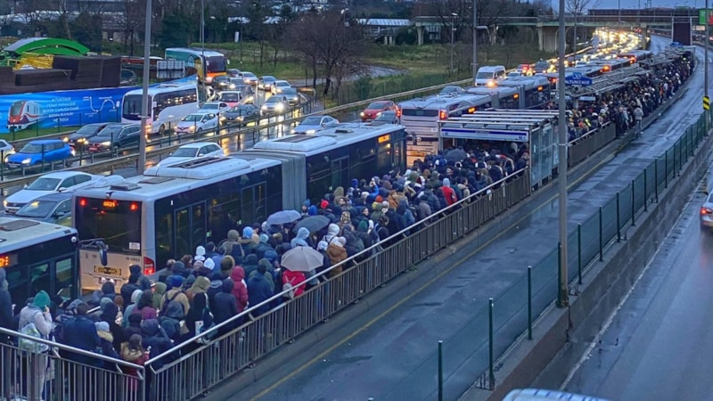 Sabah saatlerinde okula ve işe gitmek için metrobüs bekleyen vatandaşlar, uzun süre araç gelmeyince yağmur altında beklemek zorunda kaldı. İnsan kalabalığı üst geçide kadar uzanınca İBB'ye tepki de arttı.
