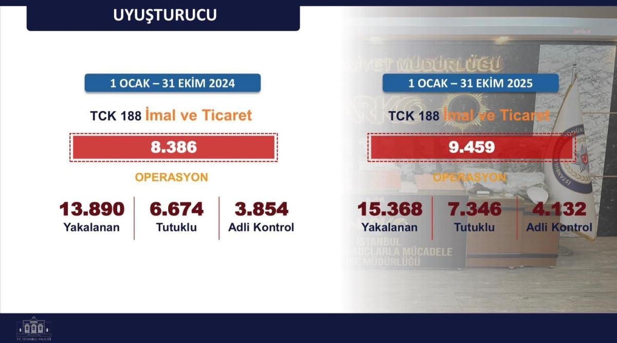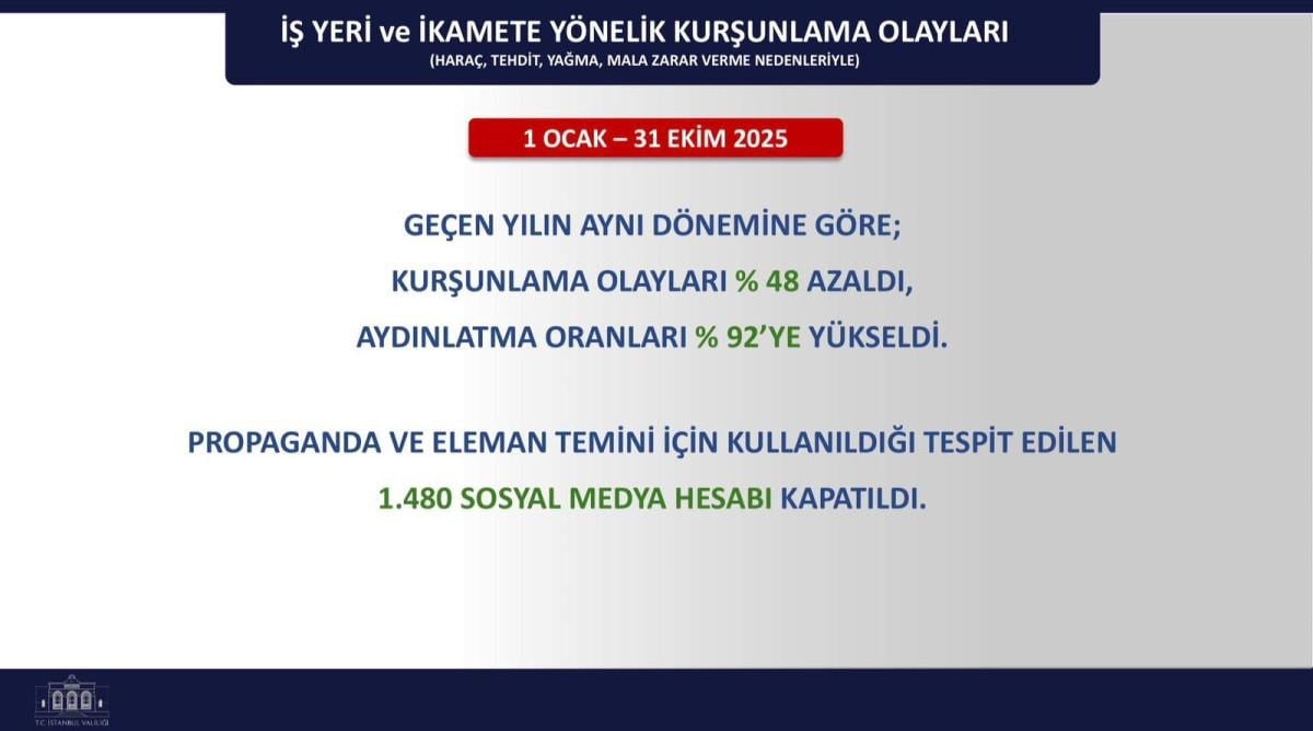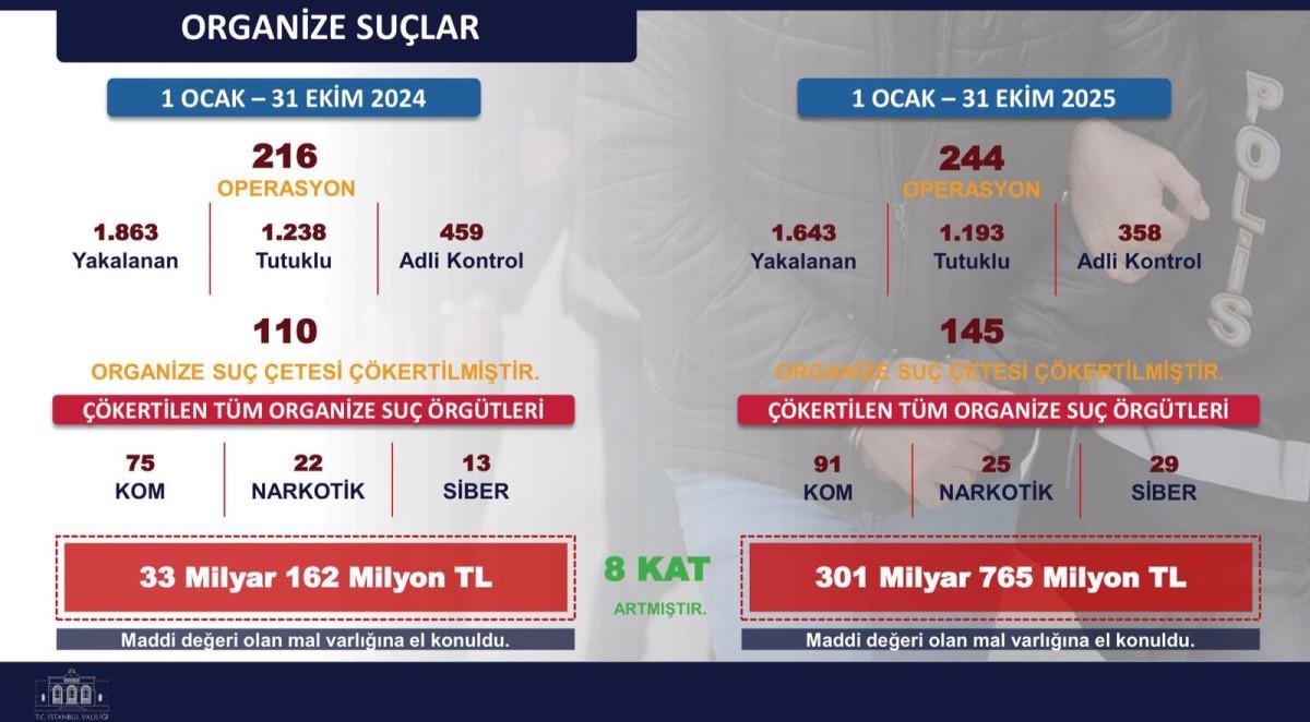 Güvenlik güçlerimiz, İstanbul’da başarılı çalışmalarına hız kesmeden devam ediyor. Güvenlik güçlerimizin başarılı çalışmaları neticesinde 2025 yılının ilk 10 ayında; 145 organize suç çetesi çökertildi, 1.643 şahıs yakalandı. Geçen yılın aynı dönemine göre el konulan mal varlığı 8 kat arttı.