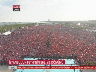 "Selam olsun aziz İstanbul'a selam olsun bu şehri muştulayan Peygambere salatü selam olsun bu muştuyu hayata geçiren Fatih Sultan Mehmet'e selam olsun. Bu bayrağı surlara diken Ulubatlı Hasan'a selam olsun. İstanbul'un taşına toprağına selam olsun. Sayın Cumhurbaşkanı ve TBMM Başkanım fethin 563. yılı kutlu olsun. Biz fetih aşkını ve sevdasını Yenikapı'ya taşıyan İstanbullulara selam olsun. Ben her zaman derim benim en büyük hocam İstanbul'dur.