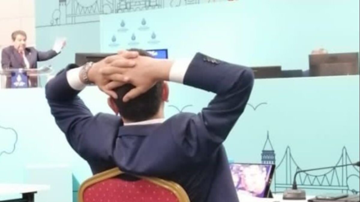 İstanbul'un sorunlarının dile getirildiği esnada İmamoğlu'nun rahat tavırları, AK Parti grubu tarafından tepkiyle karşılandı.