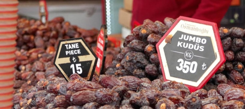 20 yıldır Mısır Çarşısı'nda esnaf olan Murat Üzümcü, “Medine hurmasının kilosu 480 lira, tanesi ise 15 lira. Tane fiyatları 10 lira ile 15 lira arasında değişiyor, hatta 20 liraya kadar yükseliyor. Geçen yıl daha ucuzdu. Kudüs’ten geldiği için dolar arttıkça artıyor, dolara göre fiyat belirleniyor." dedi